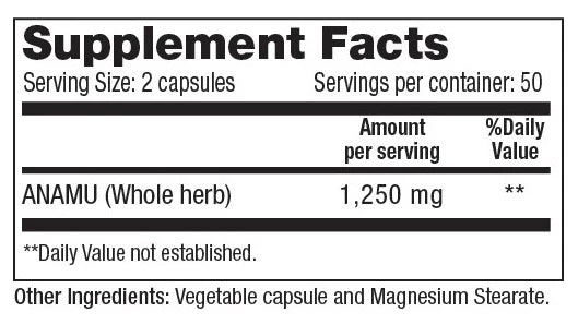 A: Simply take two capsules daily, with or without food. Each two-capsule serving provides 1,250mg of whole Anamu herb. One tub contains 100 capsules, giving you a convenient 50-day supply.
