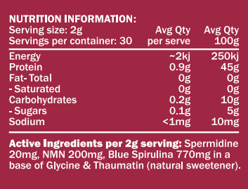 Active Ingredients per 2g Serving: Spermidine 20mg, NMN 200mg, Blue Spirulina 770mg in a base of Glycine & Thaumatin (natural sweetener)