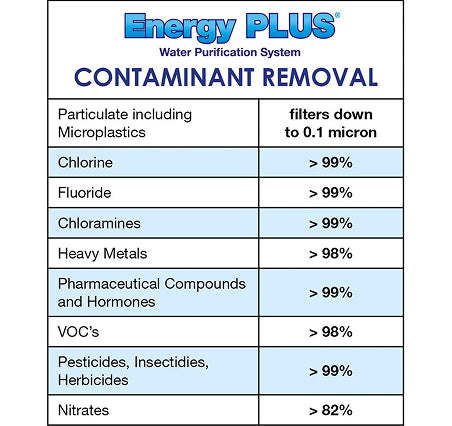 Another piece of cutting edge technology inside the Energy Plus is a unique carbon block filter, developed and manufactured in the US. This filter combines different carbon types, zeolites, and polymers, resulting in very high removal rates of heavy metals such as lead, chlorine, fluoride, chloramines, herbicides, pesticides, and hormonal and pharmaceutical residues.