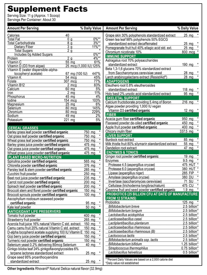 Winner of 22 awards including 13 Vity Awards, Green Vibrance is known for its research-driven approach and Full Disclosure Labelling, meaning every ingredient and its exact amount is clearly listed. There are no hidden proprietary ingredients.