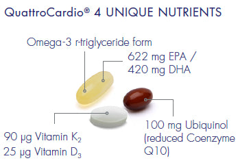 QuattroCardio brings together four carefully chosen nutrients in one unique daily supplement of 2 capsules plus 1 tablet for easy of use. Each serving includes highly concentrated omega-3 fish oil, ubiquinol coenzyme Q10, vitamin D3 and vitamin K2.