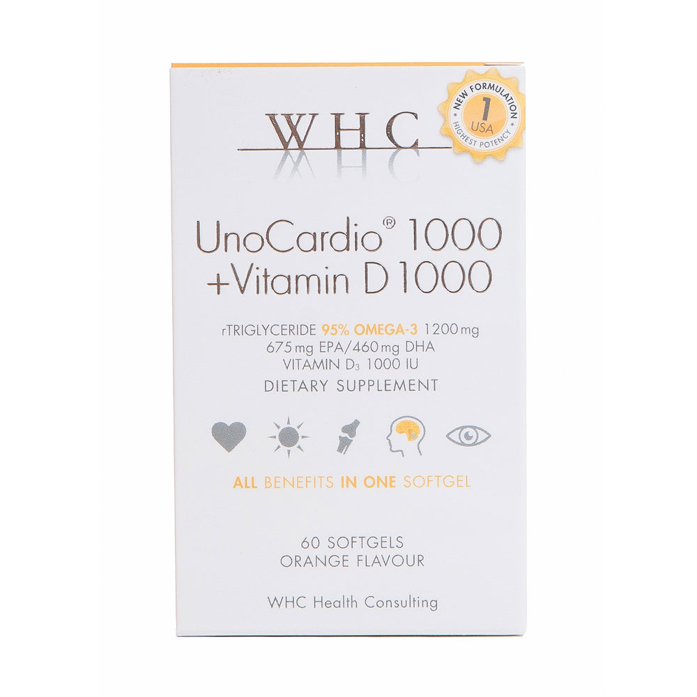 WHC UnoCardio 1000 delivers 1200 mg of concentrated omega-3s plus 1000 IU of vitamin D3 in a single daily softgel.