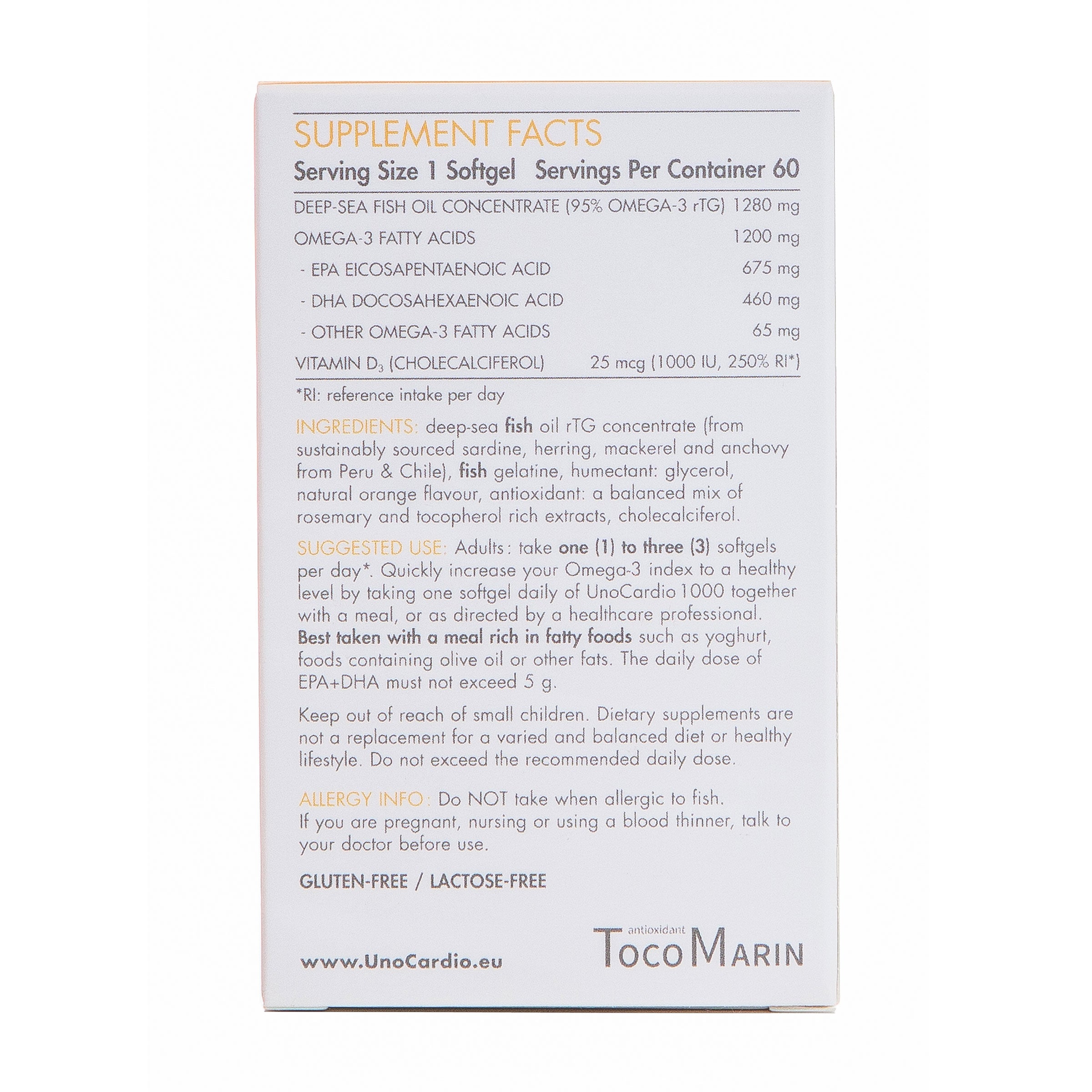 WHC UnoCardio 1000 delivers 1200 mg of concentrated omega-3s plus 1000 IU of vitamin D3 in a single daily softgel. Each capsule gives you 675mg of EPA and 460mg of DHA.